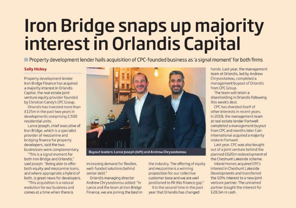 orlandis capital Orlandis Capital aquisition Orlandis CapitaL IN JANUARY 2020, PROPERTY DEVELOPMENT LENDER IRON BRIDGE FINANCE ACQUIRED ORLANDIS CAPITAL, THE REAL ESTATE JV EQUITY PROVIDER. Read more by clicking the articles below Get in touch with our team today Want to find out more? +44 (0)207 722 90 92 enquiries@ironbridgefinance.thecreativeplot.com